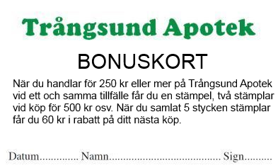 När du handlar för 250 kr eller mer på Trångsund Apotek vid ett och samma tillfälle får du en stämpel.